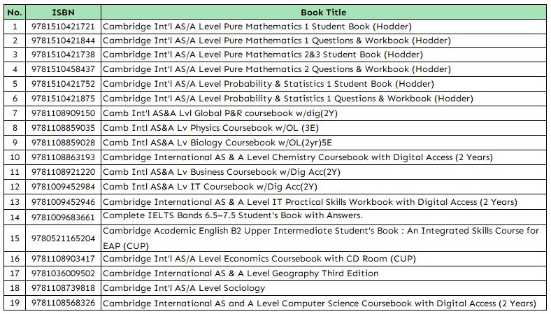 | Books | 9781510421721-Cambridge Int'l AS/A Level Pure Mathematics 1 Student Book (Hodder), 9781510421844-Cambridge Int'l AS/A Level Pure Mathematics 1 Questions & Workbook (Hodder), 9781510421738-Cambridge Int'l AS/A Level Pure Mathematics 2&3 Student Book (Hodder), 9781510458437-Cambridge Int'l AS/A Level Pure Mathematics 2 Questions & Workbook (Hodder), 9781510421752-Cambridge Int'l AS/A Level Probability & Statistics 1 Student Book (Hodder), 9781510421875-Cambridge Int'l AS/A Level Probability & Statistics 1 Questions & Workbook (Hodder), 9781108909150-Camb Int'l AS&A Lvl Global Perspective & Reasearch Coursebook w/dig(2Y), 9781108859035-Camb Intl AS&A Lv Physics Coursebook w/OL (3E), 9781108859028-Camb Intl AS&A Lv Biology Coursebook w/OL(2yr)5E, 9781108863193-Cambridge International AS & A Level Chemistry Coursebook with Digital Access (2 Years), 9781108921220-Camb Intl AS&A Lv Business Coursebook w/Dig Acc(2Y), 9781009452984-Camb Intl AS&A Lv IT Coursebook w/Dig Acc(2Y), 9781009452946-Cambridge International AS & A Level IT Practical Skills Workbook with Digital Access (2 Years), 9781009683661-Complete IELTS Bands 6.5–7.5 Student's Book with Answers, 9780521165204 – Cambridge Academic English B2 Upper Intermediate Student's Book : An Integrated Skills Course for EAP (CUP), 9781108903417-Cambridge Int'l AS/A Level Economics Coursebook with CD Room (CUP), 9781036009502-Cambridge International AS & A Level Geography Third Edition, 9781108739818-Cambridge Int'l AS/A Level Sociology, 9781108568326-Cambridge International AS and A Level Computer Science Coursebook with Digital Access (2 Years) |