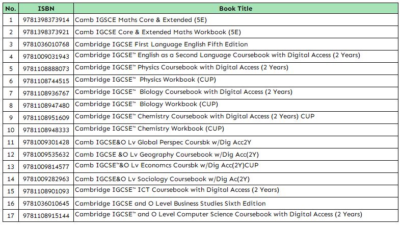 | Books | 9781398373914-IGCSE Maths Core & Extended Student Book (5E), 9781398373921-IGCSE Maths Core & Extended Workbook (5E), 9781036010768-Cambridge IGCSE First Language English Fifth Edition, 9781009031943-IGCSE English as a Second Language Coursebook with Digital Access (2 Years), 9781108888073-Cambridge IGCSE™ Physics Coursebook with Digital Access (2 Years), 9781108744515-Cambridge IGCSE™ Physics Workbook (CUP), 9781108936767-Cambridge IGCSE™ Biology Coursebook with Digital Access (2 Years), 9781108947480-Cambridge IGCSE™ Biology Workbook (CUP), 9781108951609-Cambridge IGCSE™ Chemistry Coursebook with Digital Access (2 Years) CUP, 9781108948333-Cambridge IGCSE™ Chemistry Workbook (CUP), 9781009301428-Camb IGCSE&O Lv Global Perspec Coursbk w/Dig Acc2Y, 9781009535632-Camb IGCSE &O Lv Geography Coursebook w/Dig Acc(2Y), 9781009814577-Camb IGCSE™&O Lv Economcs Coursbk w/Dig Acc(2Y)CUP, 9781009282963-Camb IGCSE&O Lv Sociology Coursebook w/Dig Ac(2Y), 9781108901093-Cambridge IGCSE™ ICT Coursebook with Digital Access (2 Years), 9781036010645-Cambridge IGCSE and O Level Business Studies Sixth Edition, 9781108915144-Cambridge IGCSE™ and O Level Computer Science Coursebook with Digital Access (2 Years) |